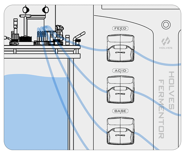 以好色先生视频网站(HOLVES)实验室好色先生TV版为例,pH电极测定完数值后,结果会直接反馈给HF-Control V2.2控制系统,系统则会根据原先设定数值进行调节补料等操作,将罐内pH值控制在最佳范围内。