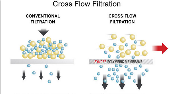 切向流过滤(TFF),也叫错流过滤(CFF),是指液体流动方向与过滤方向相垂直的过滤形式。液体流动在过滤介质表面产生剪切力,减小了滤饼层或凝胶层的堆积,从而保证了稳定的过滤速度。